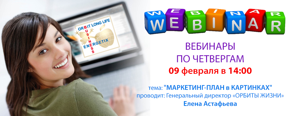 Тема вебинара 9 февраля 2017 "МАРКЕТИНГ-ПЛАН в картинках". Проводит Генеральный директор компании "ОРБИТА ЖИЗНИ" Елена Астафьева.