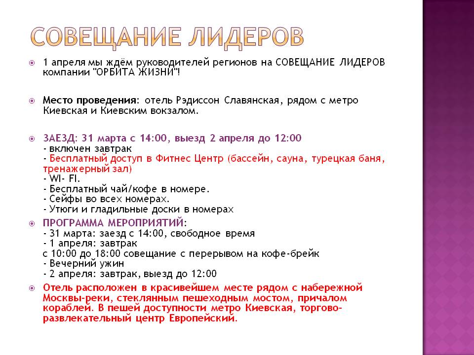 1 апреля мы ждём руководителей регионов на СОВЕЩАНИЕ ЛИДЕРОВ компании "ОРБИТА ЖИЗНИ"!